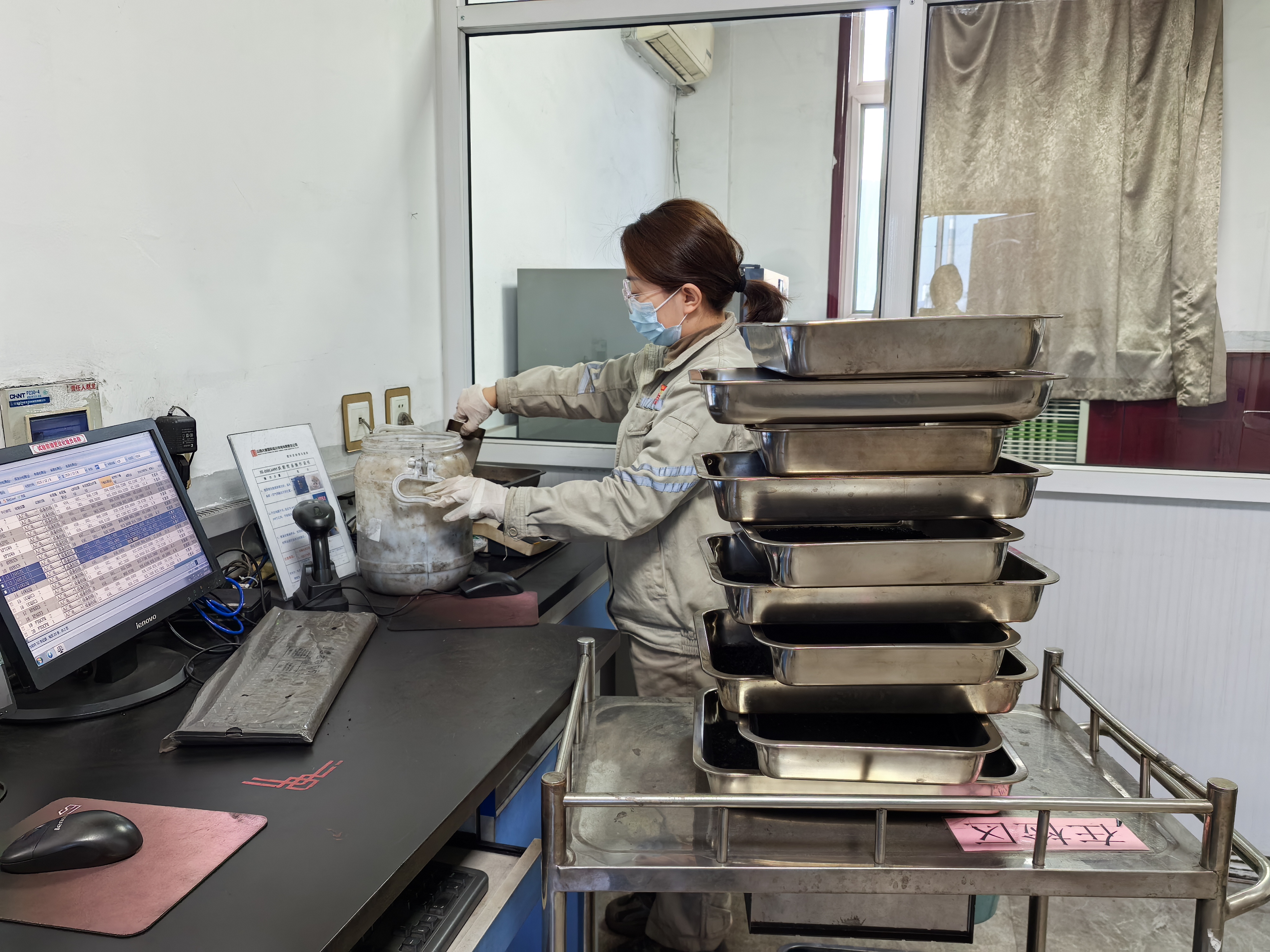 16:30化验项目终于完成,班长王彩霞喊张文锦“编号为XMUYER的煤样发热量和灰分的线性关系不好,使用其他的量热仪再次核对这组数据,确保数据的准确性”,“收到,马上核对!”,再次对此煤样进行称量、化验,20分钟后,张文锦汇报道:“班长,此次试验结果和上次测定的相差小于120J/g,化验数据没有问题”,“好的、好的”班长回复道。16:50今天的化验工作终于结束,大家开始收拾自己使用的化验室,确保化验结束后化验室整洁干净,检查水源、电源、气源关闭后,关闭化验室门窗,拿上化验样品进入0.2mm存样间进行存样。